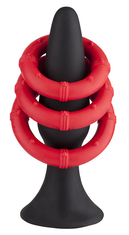 Массажер для стимуляции ануса выполнен в черном цвете и имеет рельефную поверхность. Комплект дополнен тремя кольцами для усиления эрекции у мужчин. Кольца изготовлены из медицинского силикона, безопасного в применении.