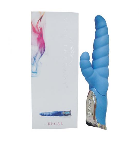 Вибромассажер голубого цвета Vibe Therapy Regal изготовлен из медицинского силикона и имеет водонепроницаемую поверхность. Модель снабжена изгибом для поиска точки G и нежным отростком для стимуляции клитора. Извилистая поверхность помогает достичь нерального удовольствия.