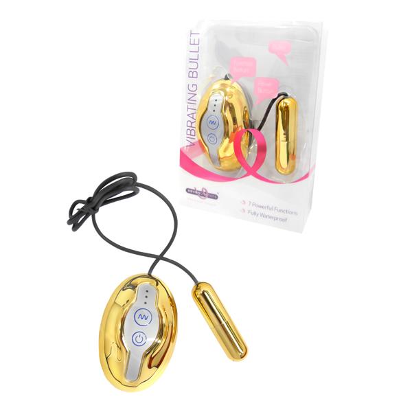 Яркая, золотая вибропуля с пультом управления понравится представительницам прекрасного пола. Производитель - компания Dream Toys, длина модели - 5 см, диаметр - 1 см.