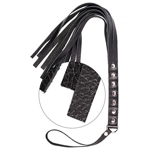 Флогер "Прямая страсть" (многохвостая гладкая плеть) состоит из тонких полос мягкой телячьей кожи высокого качества. Ручка сформирована при помощи заклепок из нержавеющей стали. Данная плеть представляет собой эксклюзивный гаджет с 12 хвостами. По толщине и структуре кожи этот флогер относится к мягким видам прелюдии и рабочим девайсам. Его плюсами является тот факт, что им можно пользоваться практически без ограничений. Он нежен и безопасен. Такая длительная работа используется, прежде всего, при разогреве (начале флагелляции). Для дополнительного комфорта имеется петля, которая одевается на руку.