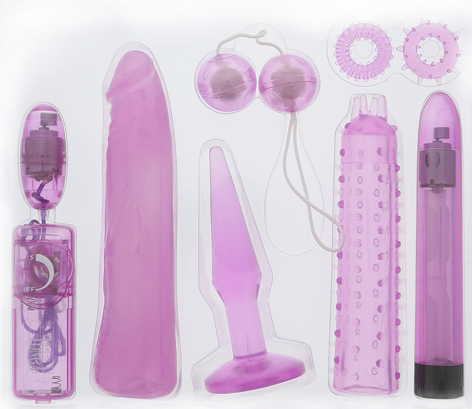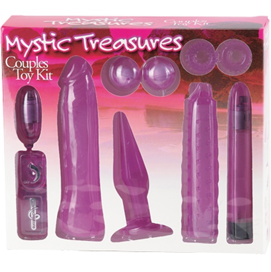 Набор массажеров и аксессуаров MYSTIC TREASURES COUPLES KIT состоит из следующих элементов: вибропуля, вибратор с насадками, вагинальные шарики.