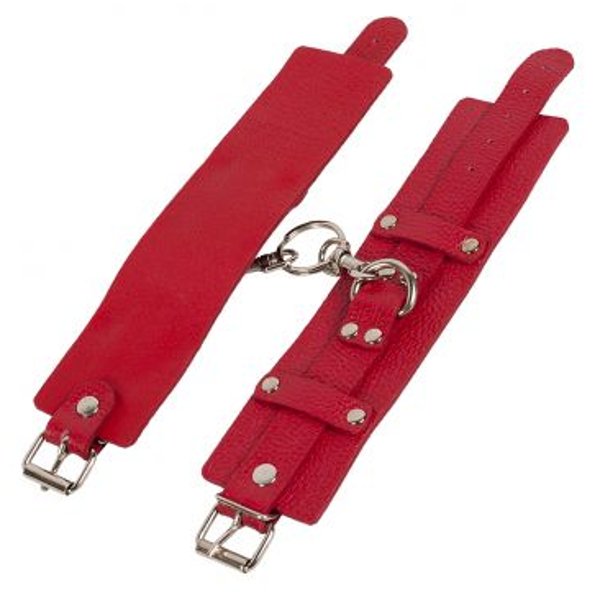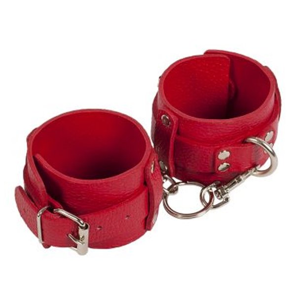 Красные наручники из кожи высочайшего качества, произведенной в Италии. Внутри кожа нежная и мягкая, не натирает при длительном применении. Наручники соединяются между собой при помощи металлических карабинов и колец. Это аксессуар для тех, кто хочет расширить свои сексуальные возможности.