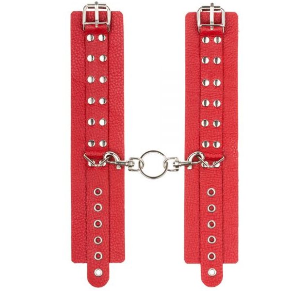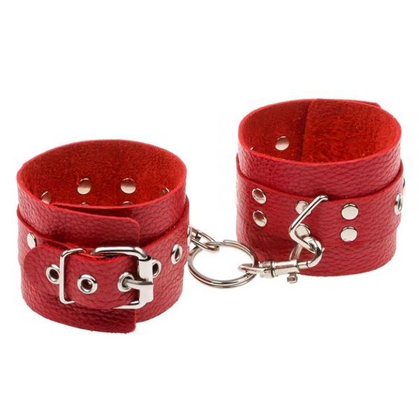 Наручники красного цвета из кожи наивысшего качества. Декорированы заклёпками из металла. Фиксируются наручники с помощью пряжки, которая легко регулируется до необходимого размера. Внутренняя подкладка изготовлена из мягкой кожи специально для комфортного ношения. Стильный аксессуар для БДСМ игр. Испытайте настоящую страсть вместе с наручниками из коллекции нашего секс-шопа.