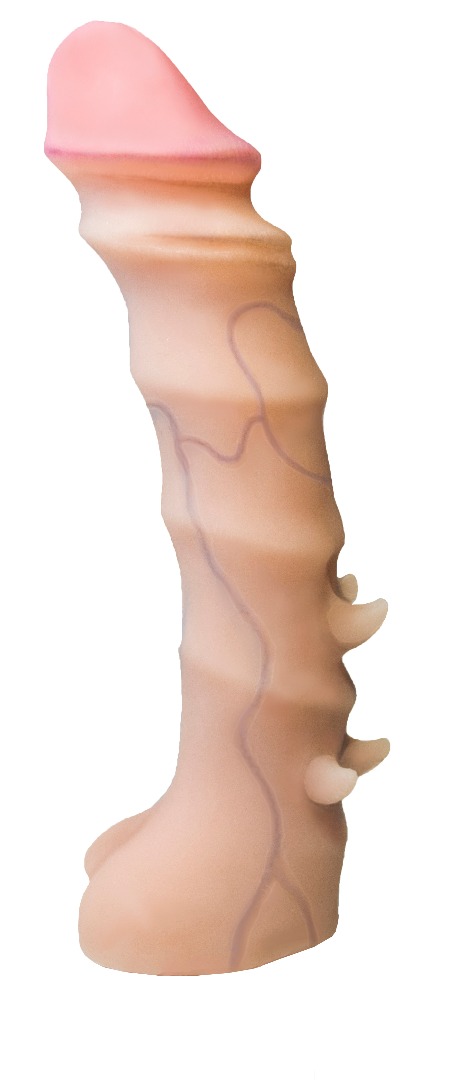 Насадка для страпона изогнутой формы для стимуляции точки G имеет рельефную поверхность, крупную головку и нежные шипы на корпусе изделия для более приятной стимуляции.