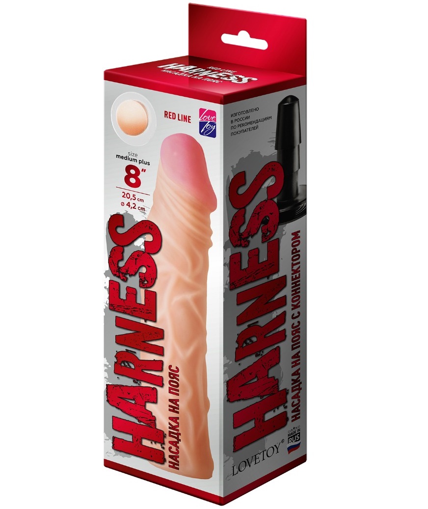 Насадка на пояс Harness в виде пениса с соединителем. Имеет выраженную розовую головку и прорисованные венки.