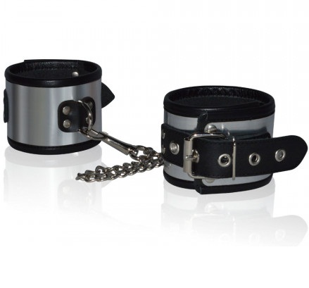 Металлические оковы от Ситабелла выполнены из натуральной высококачественной кожи и имеют гладкую поверхность. Сочетание черной кожи и имитирующей металл отделки придаёт изделию дерзости и откровенности. Гладкая поверхность не повреждает нежную кожу. Оковы соединены между собой при помощи цепочки 15 см длиною с карабинами на концах. Вся металлическая фурнитура имеет никелевое покрытие.