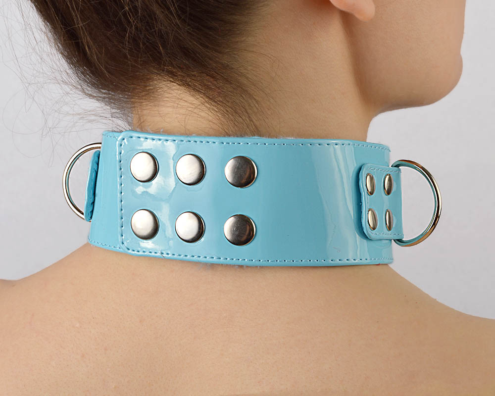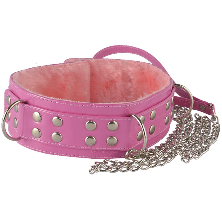 Ошейник из конфетно-розовой лакированной кожи с металлическими заклепками предназначен для БДСМ-игр и для создания эротичного образа, а также позволит управлять партнёром при помощи поводка. В качестве подкладки используется искусственный мех для предотвращения повреждения кожи шеи. Мех приятно щекочет и возбуждает. Регулируется ошейник при помощи кнопок. Фурнитура имеет никелевое покрытие. В наборе с ошейником идет поводок в виде металлической цепочки с карабином и петлёй из искусственной кожи для запястья. Этот БДСМ-аксессуар понравится гламурным особам.