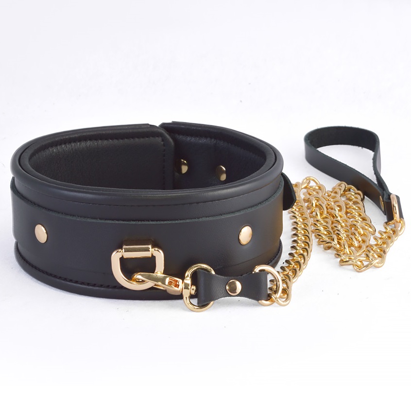 Ошейник шириной 5,5 см дополнен декоративным элементом в форме накладки из кожи с золотыми хольнитенами и металлическим кольцом, которое применяется для подсоединения поводка-цепочки к ошейнику. Общая длина поводка примерно 90 см. Размер изделия регулируется металлической пряжкой.