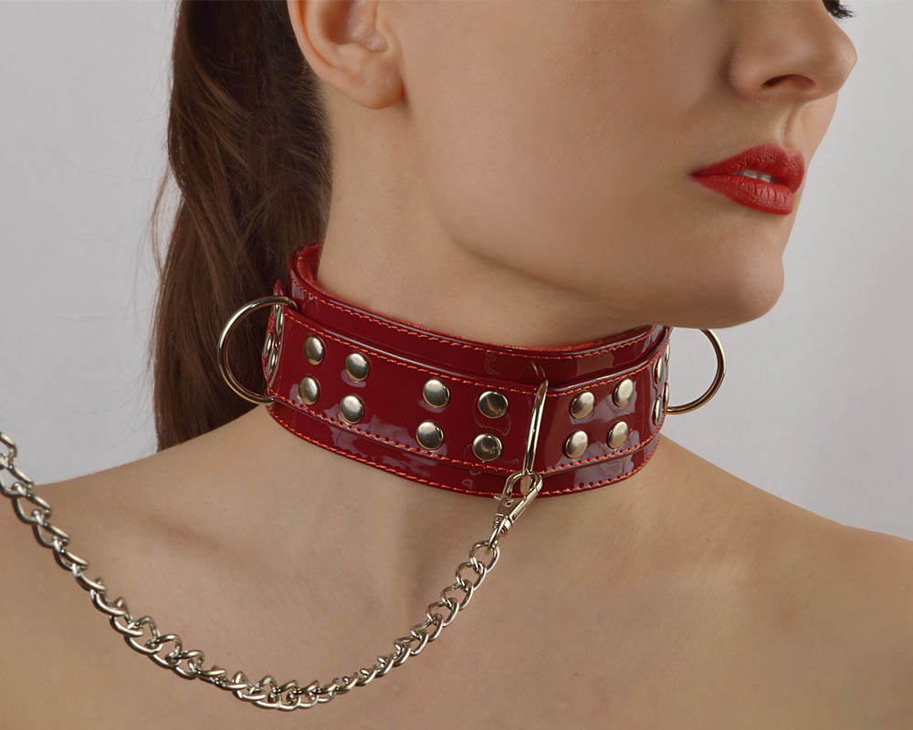 Ошейник из вишневой лакированной кожи с металлическими заклепками предназначен для БДСМ-игр и для создания эротичного образа, а также позволит управлять партнёром при помощи поводка. В качестве подкладки используется искусственный мех для предотвращения повреждения кожи шеи. Регулируется ошейник при помощи кнопок. Фурнитура имеет никелевое покрытие. В наборе с ошейником идет поводок в виде металлической цепочки с карабином и петлёй из искусственной кожи для запястья. Этот БДСМ-аксессуар занимает лидирующие позиции среди потребителей.