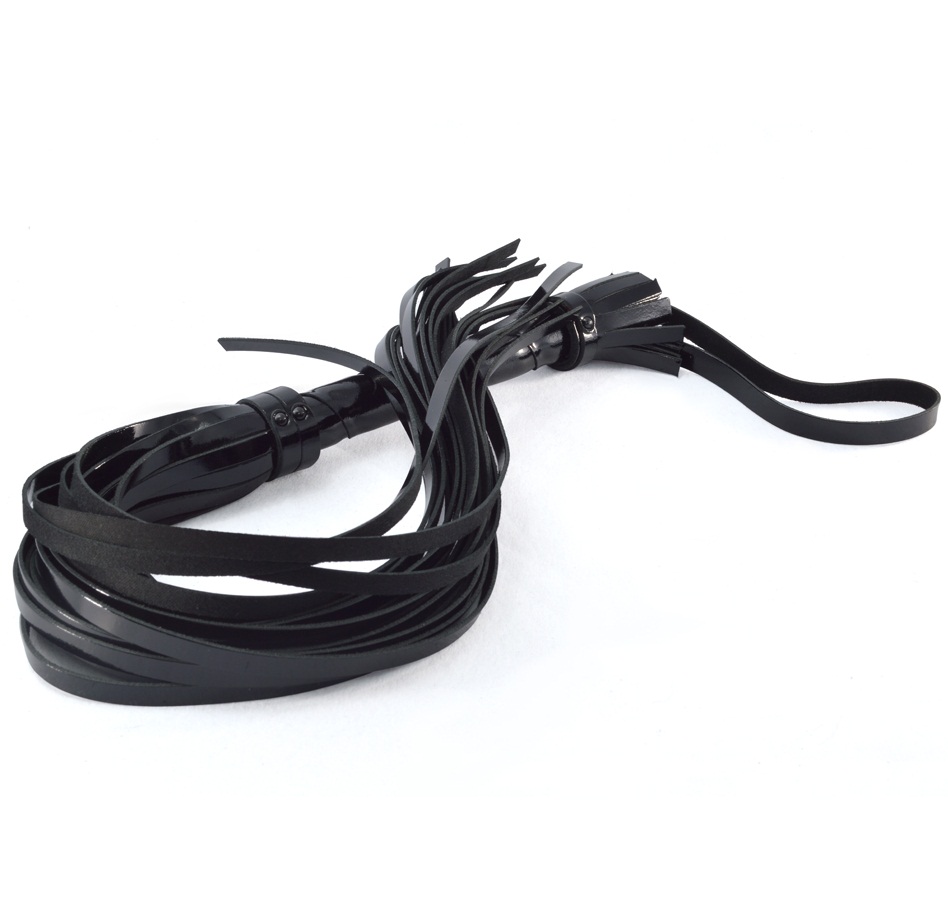 Восхитительная чёрная лаковая плеть преобразит банальные сексуальные отношения, добавит нотку пикантности и огня в отношения. Прикосновение длинных хвостов к телу оставит неизгладимые впечатления, которые захочется испытать ещё не один раз. Плеть изготовлена из натуральной лаковой кожи. Ударная часть плети состоит из плоских хвостов, шириной 1 см, количество которых варьируется от 20 до 23 шт. Рукоять обвита широкой лентой из лаковой кожи. Именно поэтому плеть очень комфортно держать в руке. Длина ручки составляет 10 см. Также для вашего удобства из торца ручки выходит кожаная петля, позволяющая носить плеть на запястье, либо хранить изделие в подвешенном состоянии. Общая длина плети 65 см.