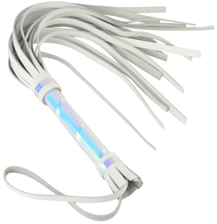 Белая плеть с рукояткой перламутрового оттенка понравится парам, которые ценят стиль и неординарность. Такая плеть станет настоящим украшением прикроватной тумбочки в вашей спальне. Плеть выполнена из натуральной кожи белого цвета. Ударная часть плети имеет 20-22 плоских хвоста, это даёт возможность произвести качественную и комфортную флогеляцию. Тонкий ремешок-петля на торце ручки позволяет освободить руки, перемещая девайс на запястье.
