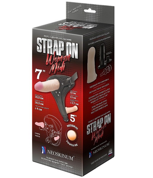 Внешняя насадка дополнена вибратором на проводе и пультом управления. На трусиках имеется кармашек для размещения пульта. Внутренняя насадка (меньшего размера) входит в набор. Это сделано, потому что аналогов такой формы и размера нет в классической коллекции магазина. Размерный ряд внутренних насадок состоит из трех моделей. В подарочном варианте с коробкой - всегда полный комплект. В варианте «Эконом» внешнюю насадку предлагается выбрать по своему вкусу.