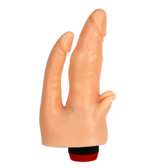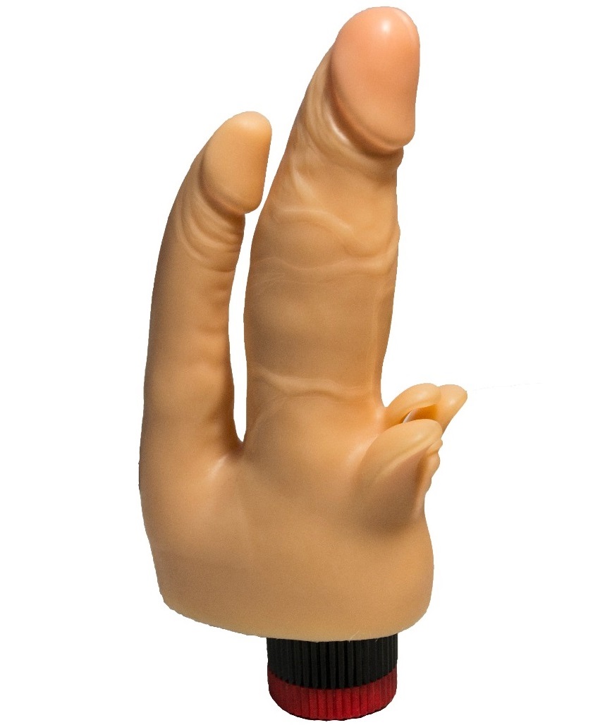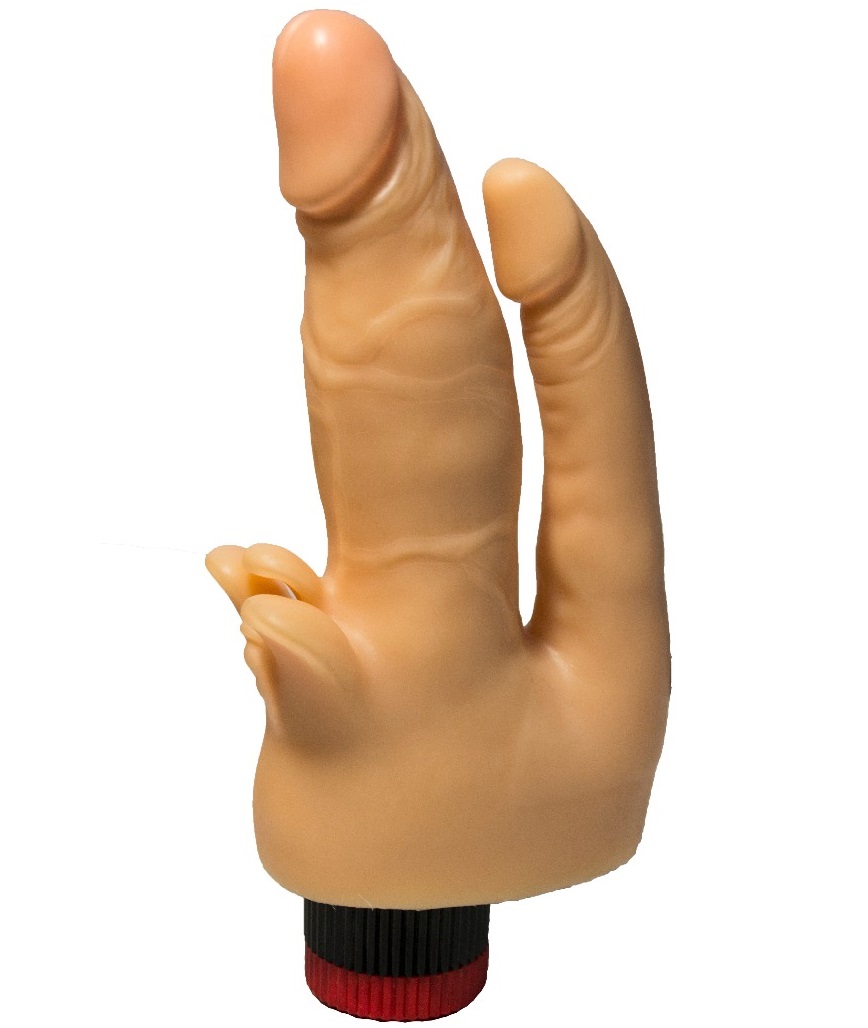 Реалистичный вибромассажер двойной для стимуляции влагалища и ануса. Отростки у основания стимулируют клитор и преддверие влагалища.