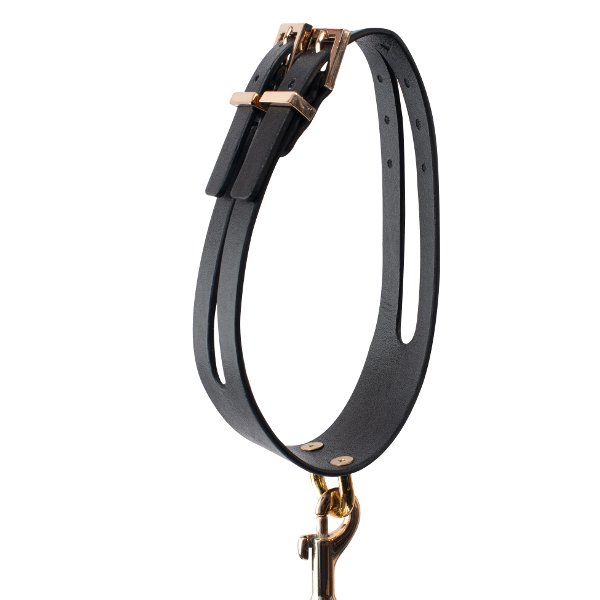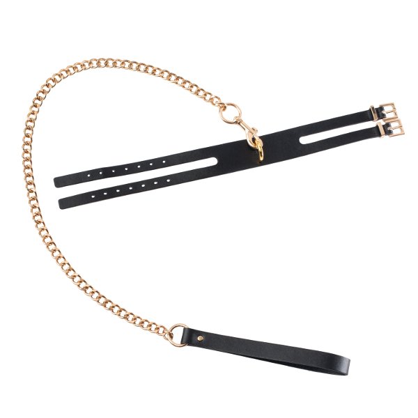Этот ошейник с поводком из БДСМ-коллекции Guilty Pleasure изготовлен из веганской кожи и металла золотистого цвета. Ошейник имеет 2 золотые пряжки для регулировки размера, поводок имеет цепочку длиной 60 см и поворотный крючок для застежки. Таким образом, поводок можно снять или прикрепить другие вещи к D-образному кольцу на ошейнике.