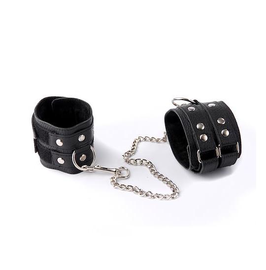 Черные оковы с велюровой подкладкой изготовлены из натуральной кожи. Оковы не натирают и не раздражают кожу щиколоток и соединяются друг с другом цепочкой длиной 35 см с двумя карабинами. Подходят для любого размера. Все заклепки выполнены из никеля.