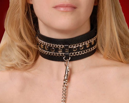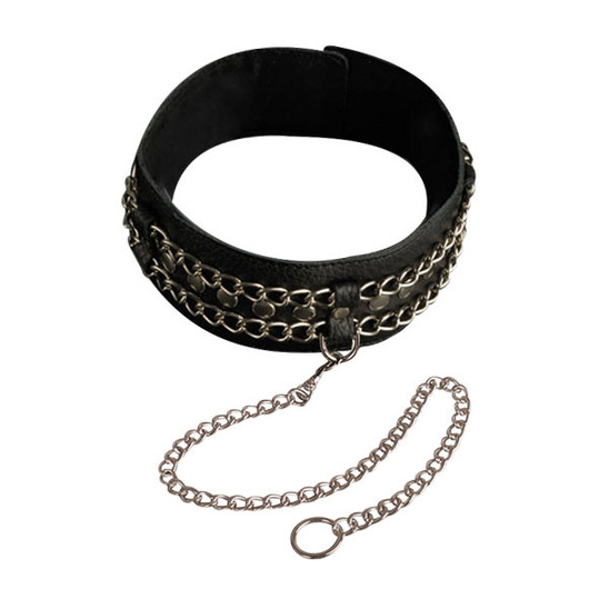 Ошейник с цепочкой станет атрибутом ролевых игр и подарит радости сексуальной жизни. Ошейник поможет обладать вашей добычей и требовать отдачи от нее в виде интимных ласк. Ошейник выполнен из натуральной кожи и имеет мягкую велюровую подложку, чтобы не раздражать нежную кожу шею. Заклепки изготовлены из никеля.