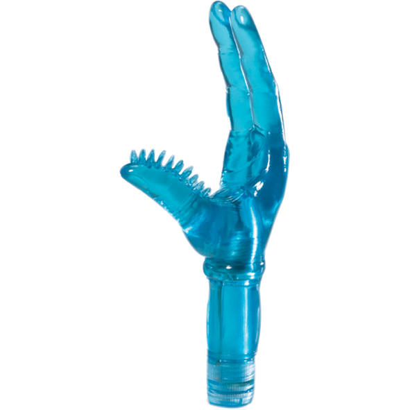 Вибромассажер-клиторальный стимулятор Two Finger Juicer Junky выполнен в виде руки с пальцами, которые способны стимулировать не только влагалище и клитор, но и анальное отверстие. Модель имеет неровную поверхность с пупырышками для более сильных ощущений.