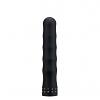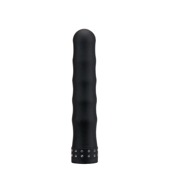 Вибромассажер черного цвета имеет ребристую поверхность и огранен стразами.