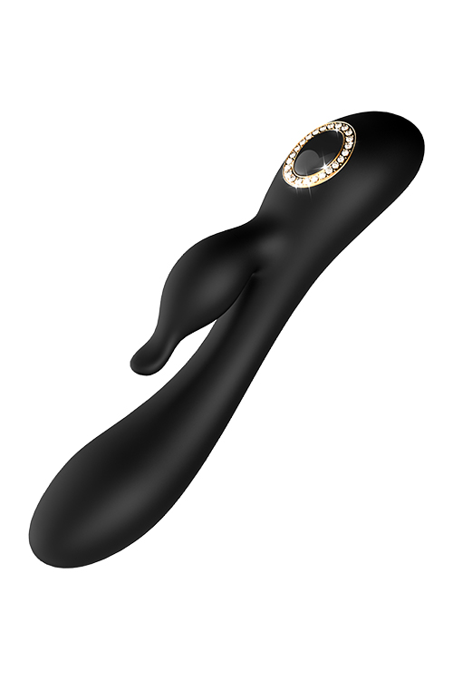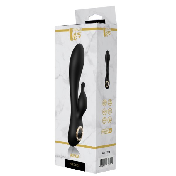 Вибратор Alexia из коллекции Prestige от Dream Toys - это черный стимулятор со стильной кнопкой в форме драгоценного камня с золотым кольцом, довольно большой гибкой головкой и гибким стимулятором клитора. 2 мощных двигателя обеспечивают 7 режимов вибрации и 3 скорости. Вибратор Alexia перезаряжается с помощью прилагаемого магнитного USB-кабеля. Он изготовлен из мягкого твердого силикона и ABS, IPX7 водонепроницаем и безопасен для тела, не содержит фталатов и латекса. Управление может осуществляться с помощью одной сенсорной кнопки в основании вибратора, которая при активации загорается синим светодиодом.