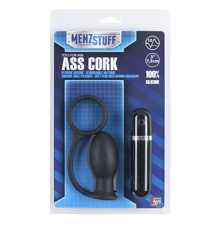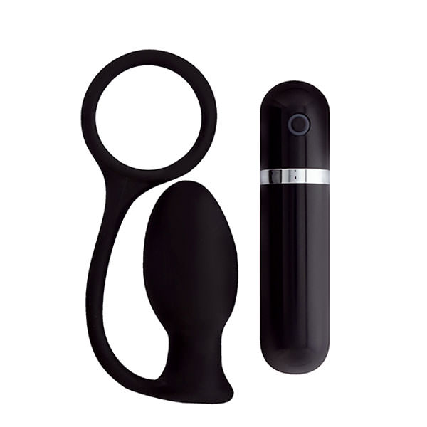 Вибромассажер анальный черного цвета выполнен из медицинского силикона и дополнен кольцом на фаллос. Снабжен десятью режимами вибрации. Управляется с помощью пульта, дополнен ограничителем.