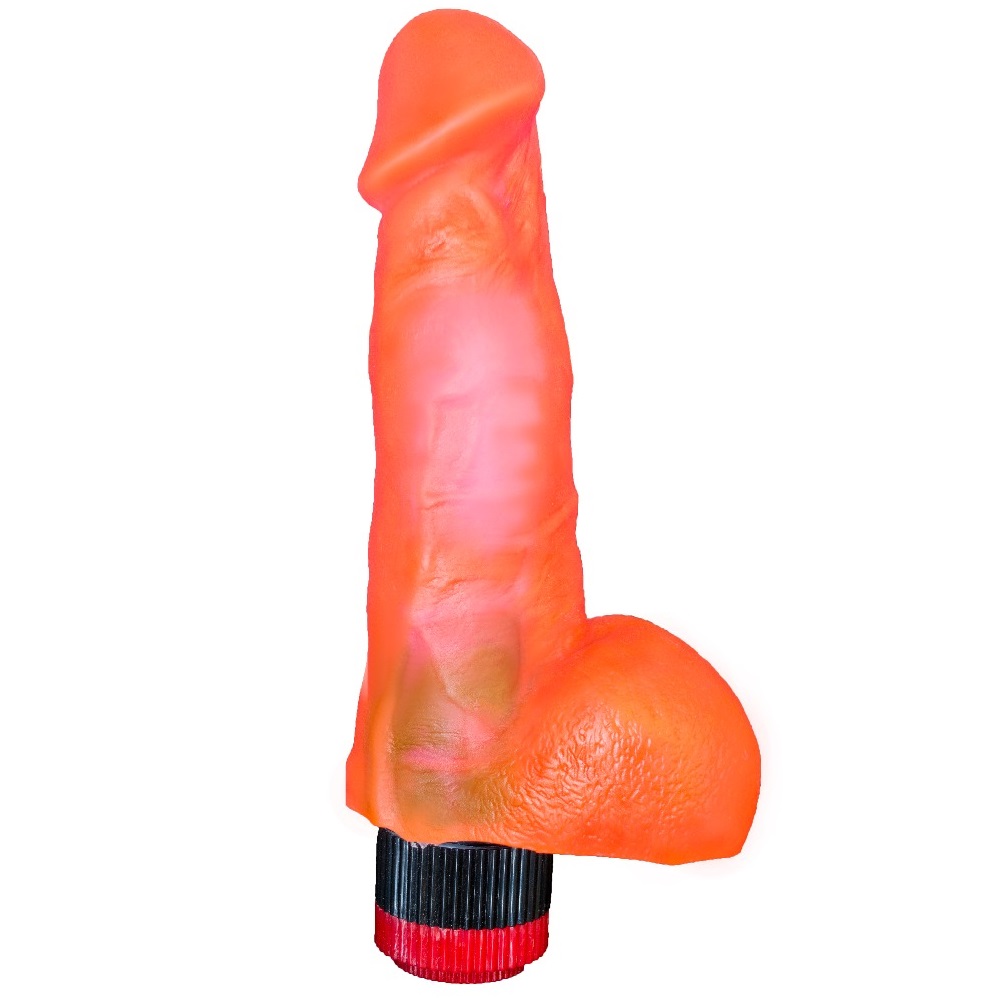 Вибромассажер гелевый с мошонкой и выраженной головкой. Имеет реальный прототип. Среднего размера. Данное изделие имеет полужесткий корпус. Эластично сгибается. Интенсивная регулируемая вибрация.