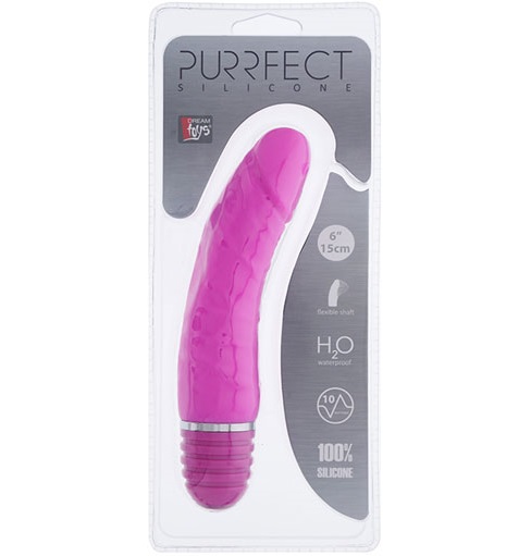 Изогнутый вибромассажер ярко-розового цвета Purrfect Silicone Vibrator 6 inch изготовлен из медицинского силикона и имеет функцию нагрева от тела. Модель имеет 10 режимов вибрации и водонепроницаемый корпус, что позволяет использовать его в душе.