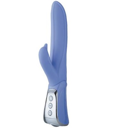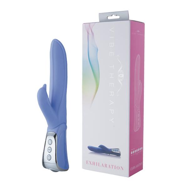 Вибромассажер голубого цвета с клиторальным стимулятором VIBE THERAPY «EXILARATION» имеет водонепроницаемую поверхность и несколько режимов вибрации. Произведено в Китае.