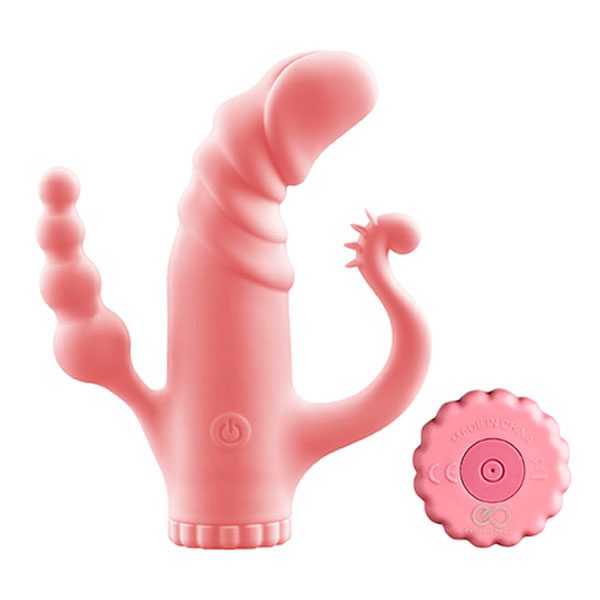 Функциональный вибромассажер с тройной стимуляцией (клиторально-анально-вагинальной). Рельефный и изогнутый вагинальный фаллоимитатор. Анальный стимулятор в виде цепочки шариков. Клиторальный стимулятор с "пупырышками". Перезаряжаемая модель.