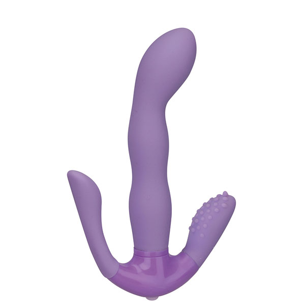 Вибромассажер причудливой формы для вагинальной, анальной и клиторальной стимуляции. Имеет 3 скорости вибрации. Водонепроницаемая поверхность. Вагинальная часть вибратора слегка изогнута для стимуляции точки G. Также имеется анальный стимулятор и клиторальный стимулятор с шипиками.