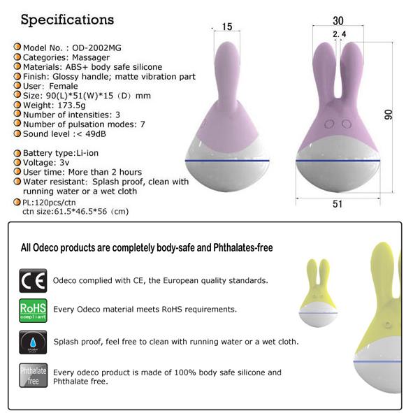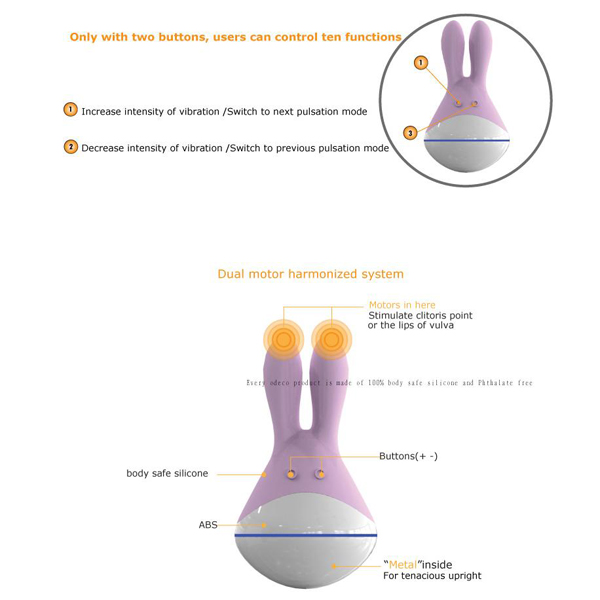 Вибромассажер-клиторальный стимулятор небольшого размера умещается даже в дамскую сумочку. Имеет два мощных вибратора, которые располагаются в ушках, и круглый выпуклый живот. Изготовлен из безопасного пластика и силикона. Выглядит, словно игрушка из детства. Доставит нереальное удовольствие и внесет разнообразие в интимную жизнь партнеров.