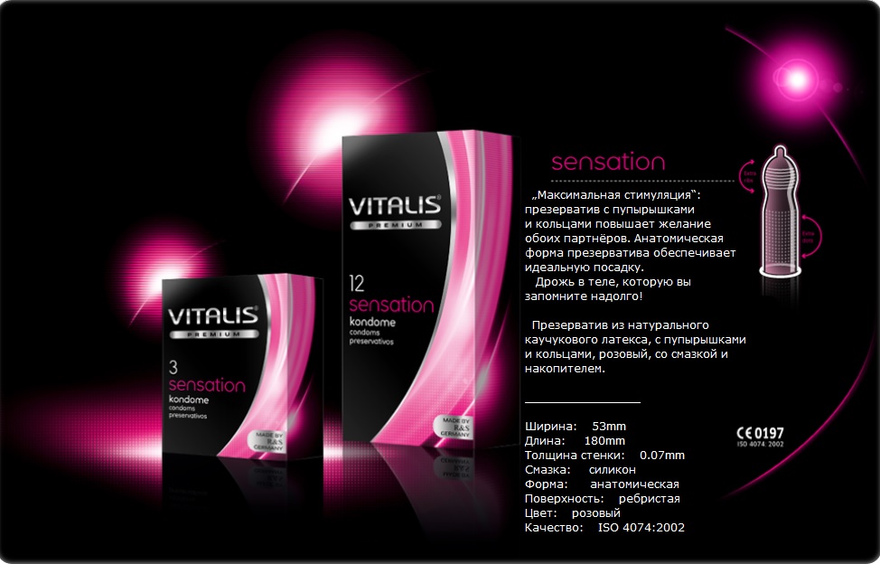 VITALIS® представляет презервативы премиум-класса, прошедшие лабораторные исследования и получившие сертификат качества. Данная серия представлена широкой палитрой различных размеров, форм, цветов и ароматов. Специальное покрытие и смазки удовлетворят запросы Ваших самых требовательных клиентов!