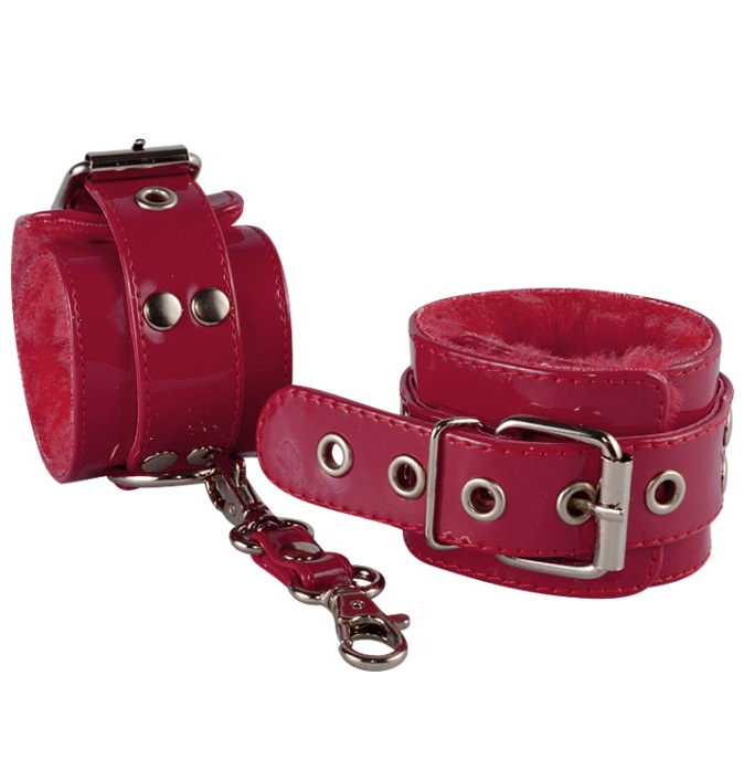 Наручники из искусственной лаковой кожи вишневого цвета. Красный - цвет любви и страсти. Внутренняя сторона изделия декорирована мягким искусственным мехом. Соединяются наручники при помощи перемычки с двумя карабинами.